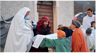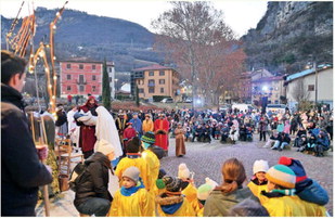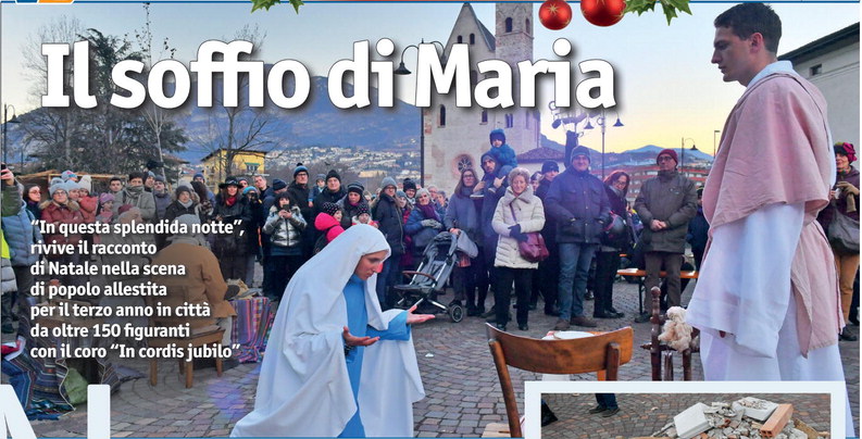 Nel presepe vivente ognuno - anche lo spettatore - si sente al posto giusto, lì, al momento giusto. Come se l’Avvento fosse veramente finito, “e si compirono per Lei i giorni del parto”. Dopo settimane di programmazione, di ricerca e rifinitura dei costumi, dopo le prove generali – non solo dell’abito ma anche dell’animo – si può cantare “Adeste fideles”, venite, lieti e trionfanti. Non si è interpreti, ma tutti protagonisti e partecipi, qui sulla piazza del rione trentino di Piedicastello, una Greccio montanara bagnata dall’Adige.